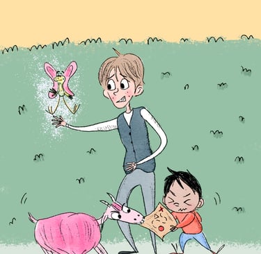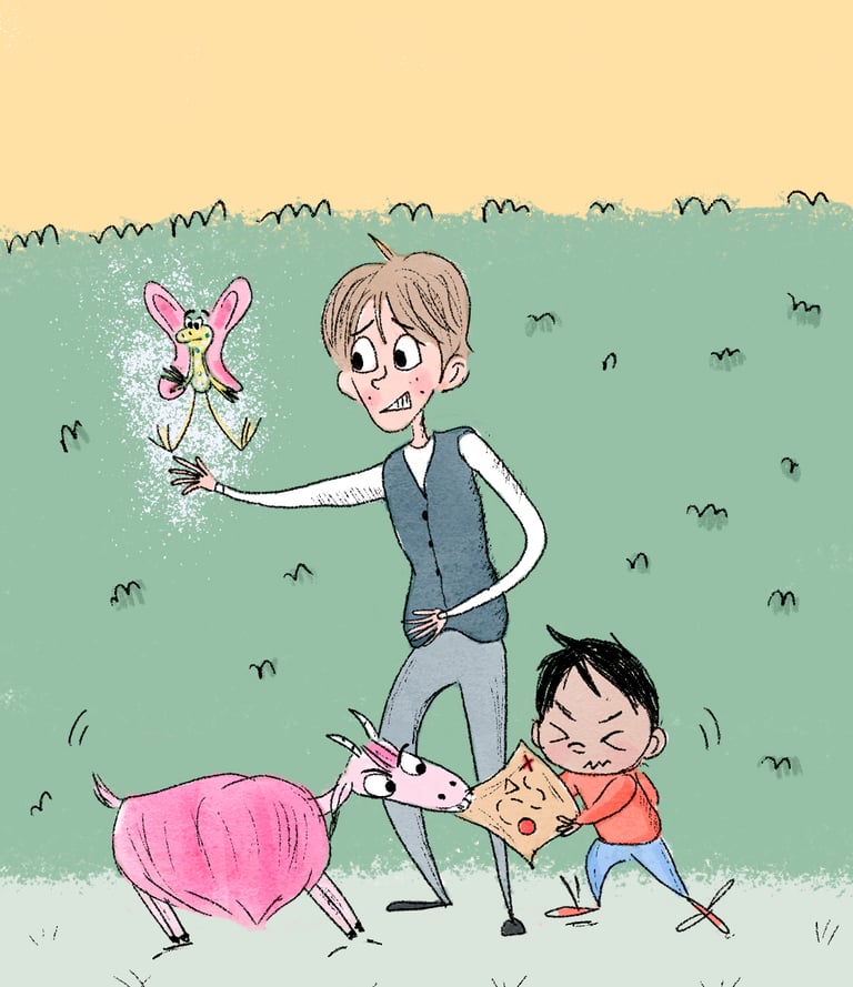 ¡Te doy la bienvenida a las locas aventuras de estos peculiares personajes! ¿Qué pasaría si un aprendiz de mago (un poco torpe), un niño con una curiosidad enorme y una cabra..¿Rosa? se cruzaran en el camino.